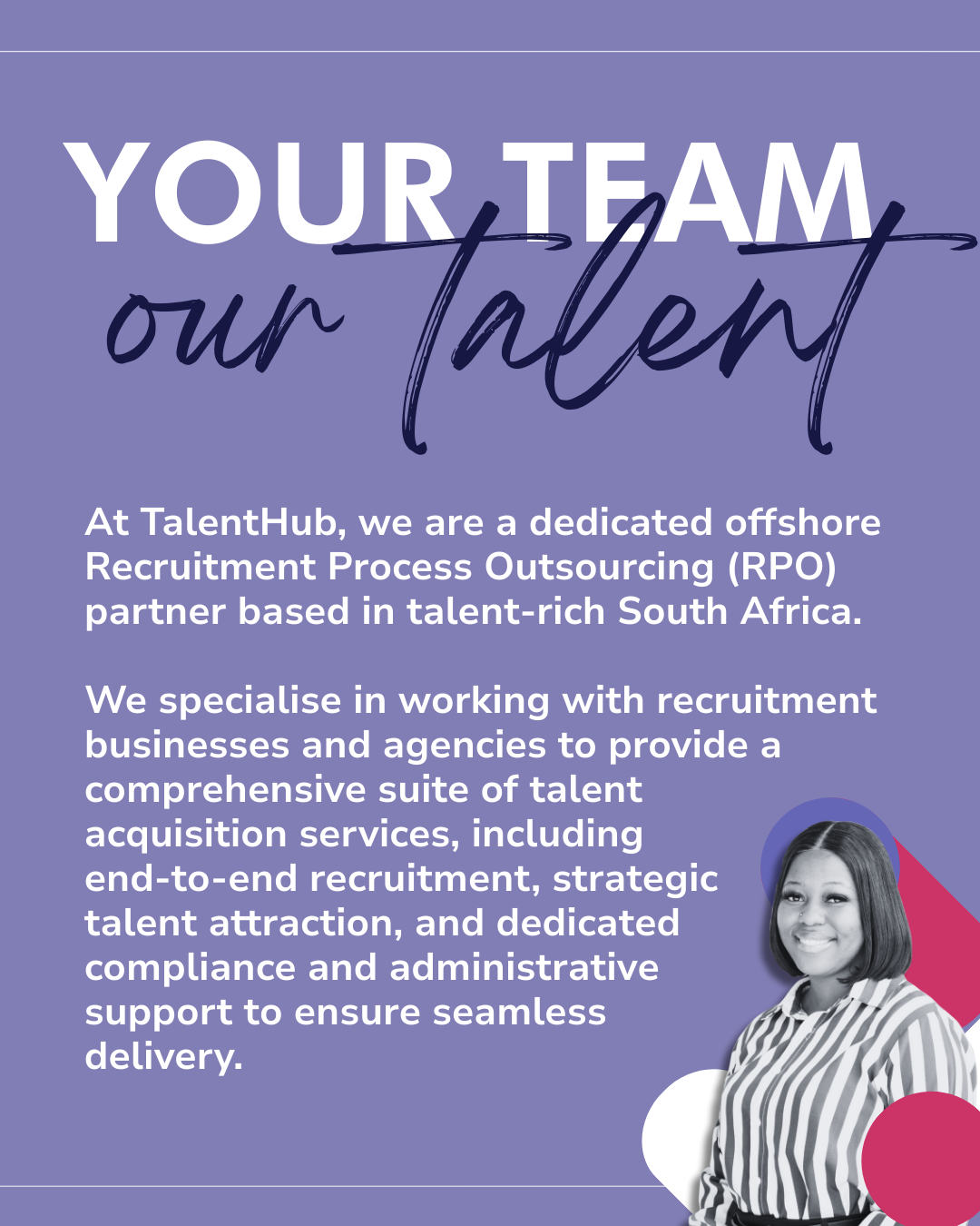 At TalentHub, we are a dedicated offshore Recruitment Process Outsourcing (RPO) partner based in talent-rich South Africa.
